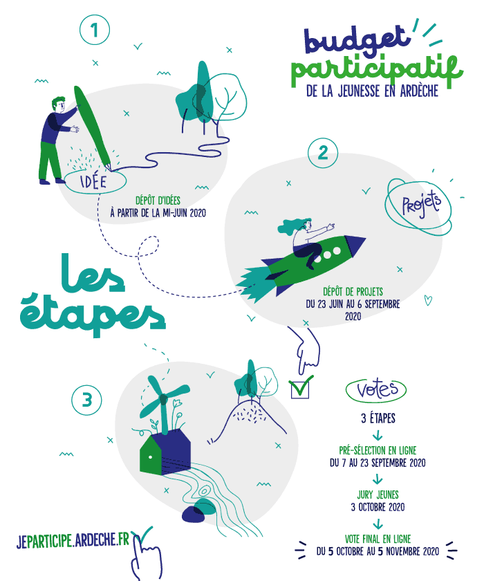 - Du 7 au 23 septembre : la pré-sélection en ligne. Tou.te.s les Ardéchois.es, quel que soit leur âge auront la possibilité de présélectionner leurs projets préférés, avec une majoration de +10% quand ils ont entre 11 et 30 ans.